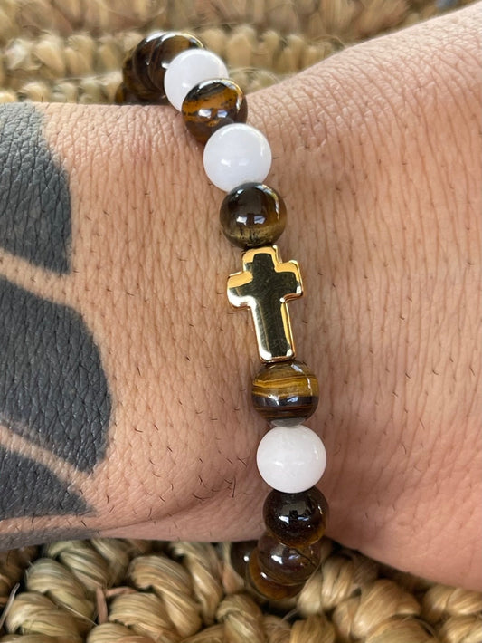 Natural Tiger Eye and White Malaysia Jade Beads with Stainless Steel Gold Cross - Stretchy Bracelet - Round Beads Natural Stone Bracelet