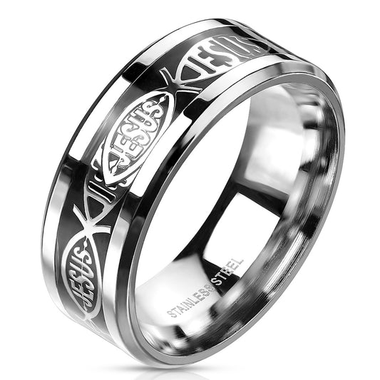 Silver Jesus Fish on Black Center Inlaid 316L Stainless Steel Band Rings