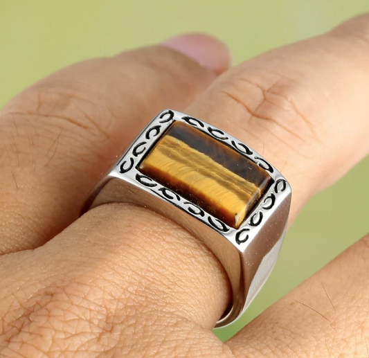 Tiger Eye Stone on Lizard Skin 316L Stainless Steel Ring