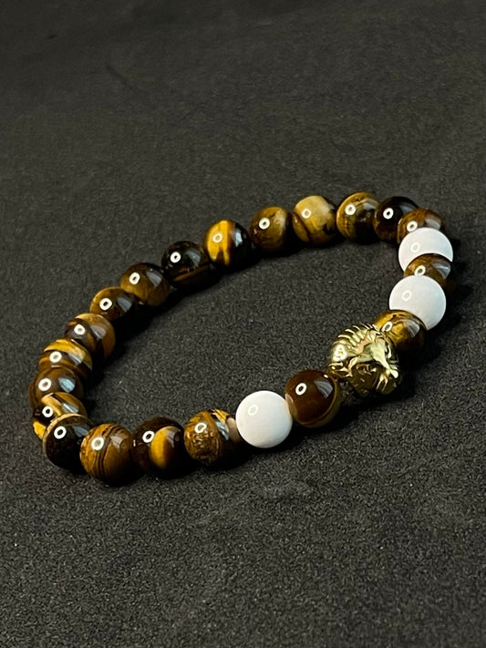 Unisex Beautiful Stainless steel Gold plated Lion - Tiger Eye with Malaysia white beads - Men’s - Woman