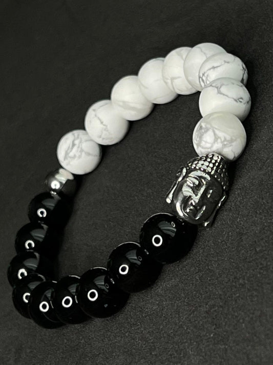 Unisex bracelet, black onyx, white Frosted Howlite - Stainless Steel Buddha head, Cross, Hamsa hand Men’s Women’s