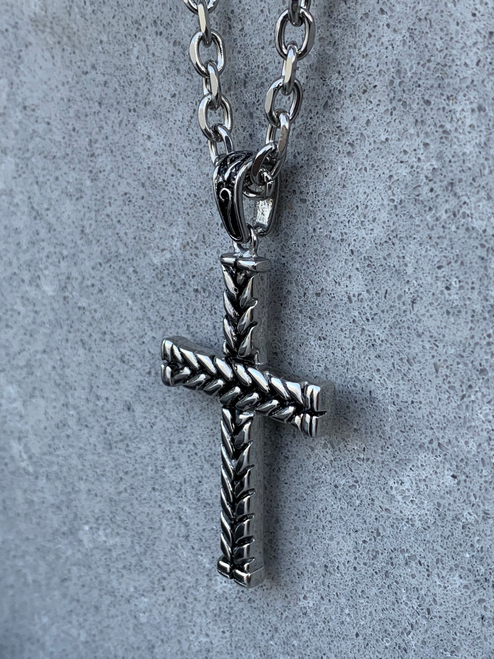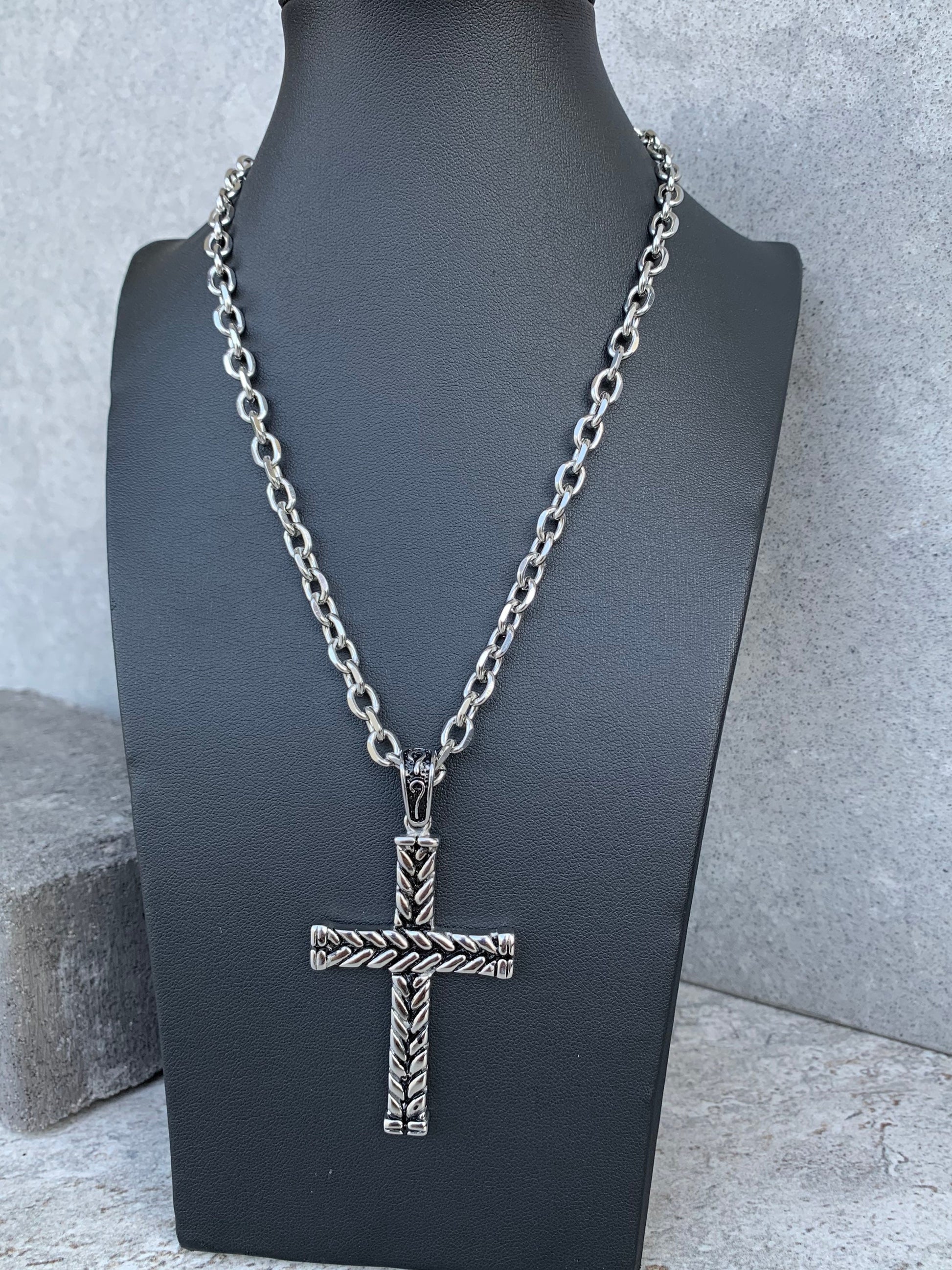 Pendant Curb Chain Cross Mens necklace - Stainless Steel with Tribal Pattern Clasp