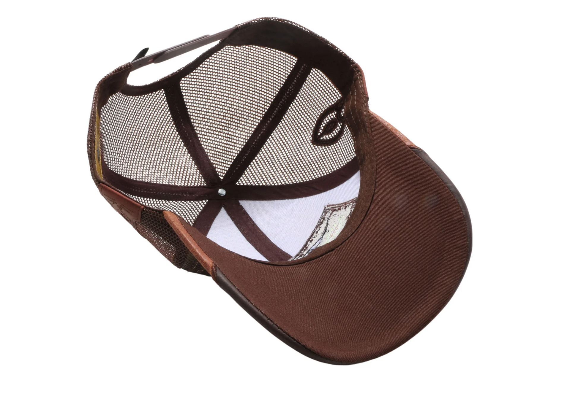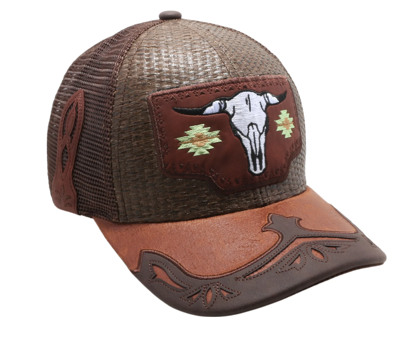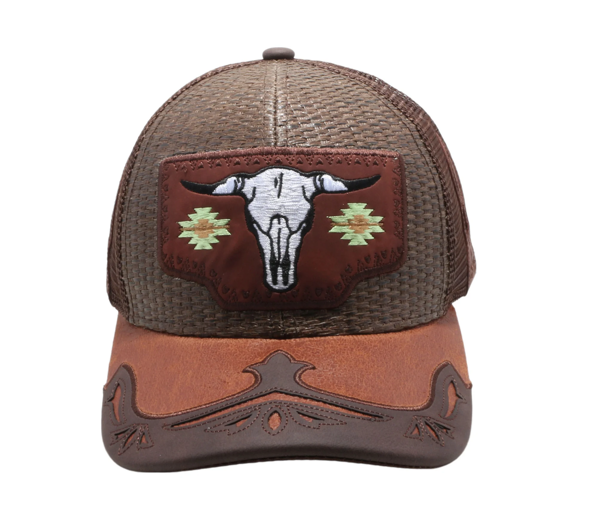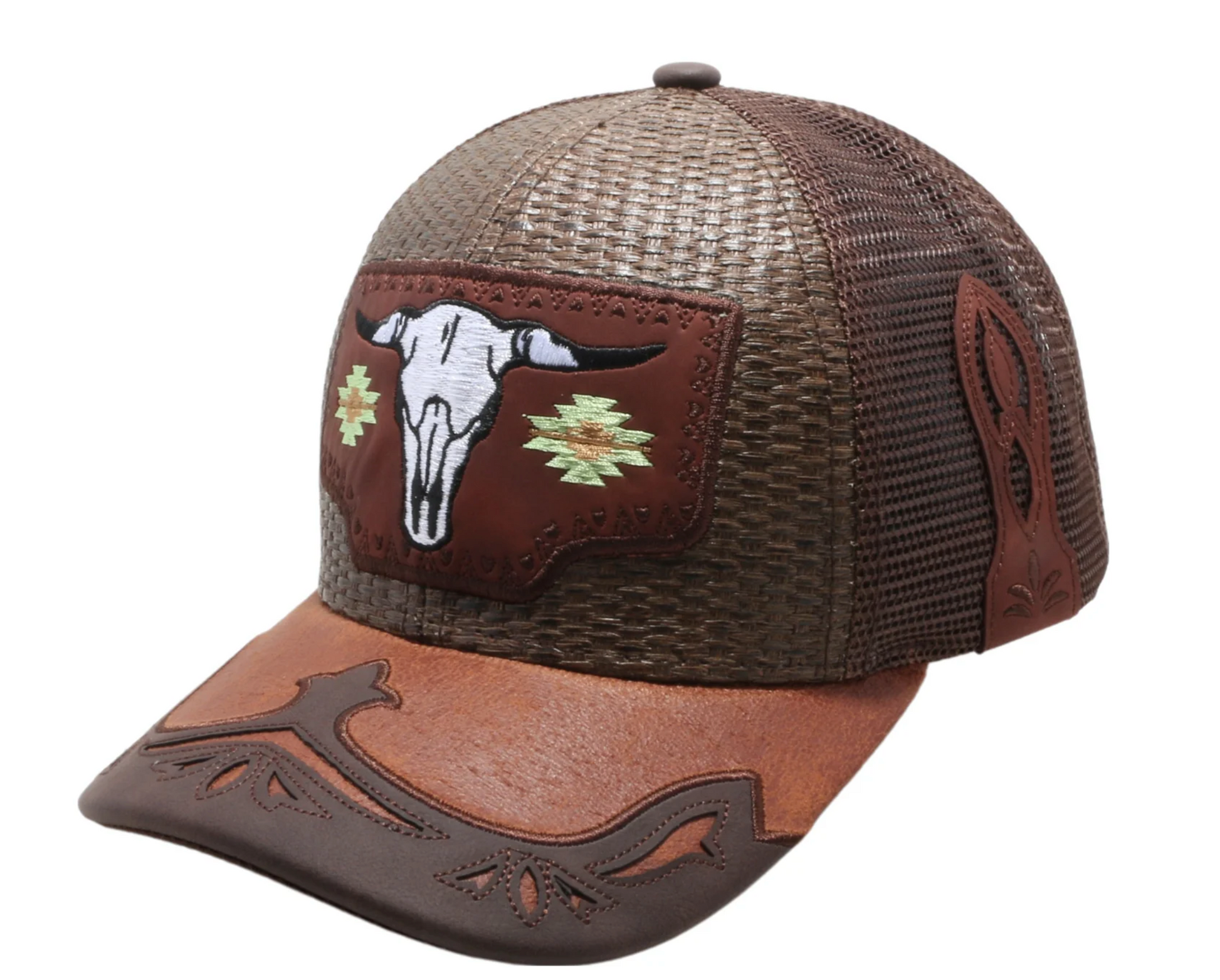 Expertly crafted with breathable straw fabric, this Cow Skull Brown Straw Fabric Trucker Hat is perfect for keeping you cool and stylish in any season. With a classic trucker hat design and timeless brown color, this hat is a must-have for any fashion-forward individual. Grab yours today!